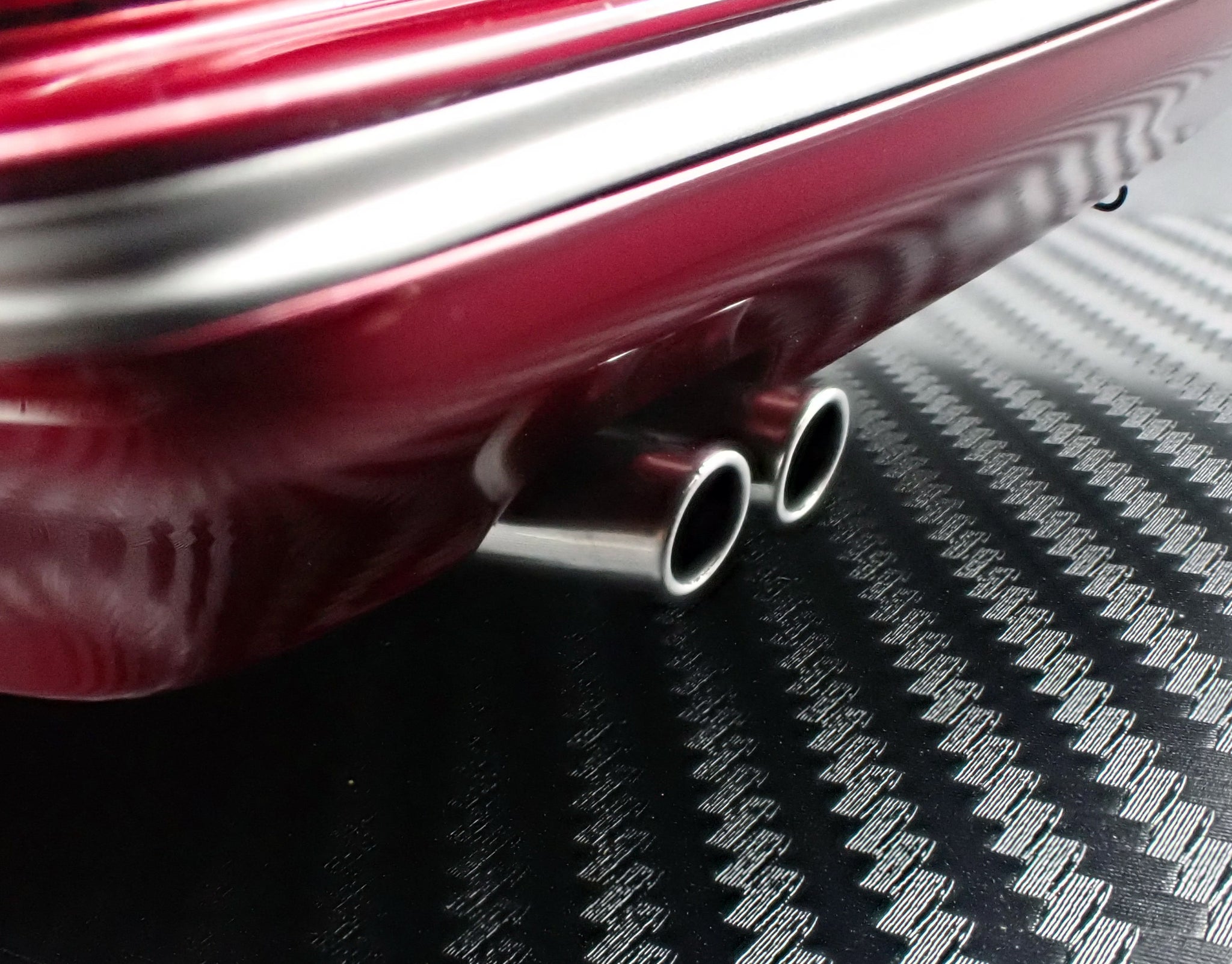 Features include front lip spoiler, trunk spoiler, dual exhaust, phone antenna, silver hood ornament, OEM seats, and OEM steering wheel.